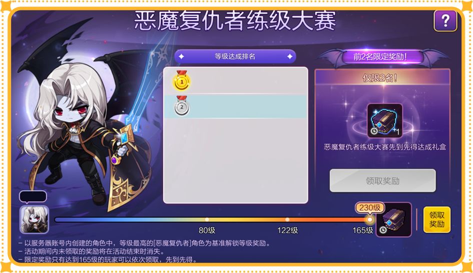 冒险家创建恶魔复仇者角色后,自动参加该活动。每个服务器账号只能用账号内等级最高的恶魔复仇者角色参加1次该活动。