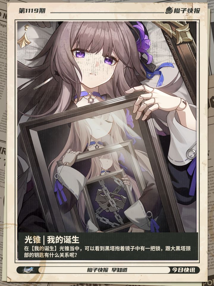 还有一点是在之前黑塔光锥【我的诞生】当中,黑塔手里抱着的镜子中有一个锁,与钥匙非常吻合。