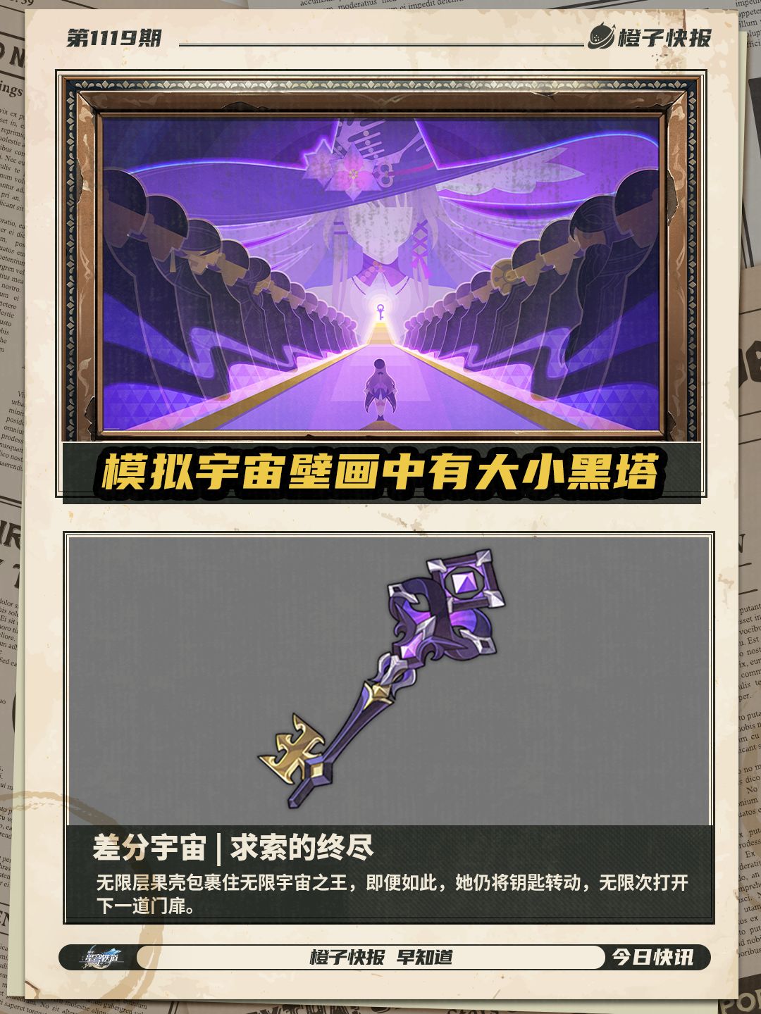 大黑塔的立绘手拿的法杖与差分宇宙的那一把钥匙【求索的终尽】一样,并且在差分宇宙的壁画中也出现了这把钥匙,不知道会有什么关联。