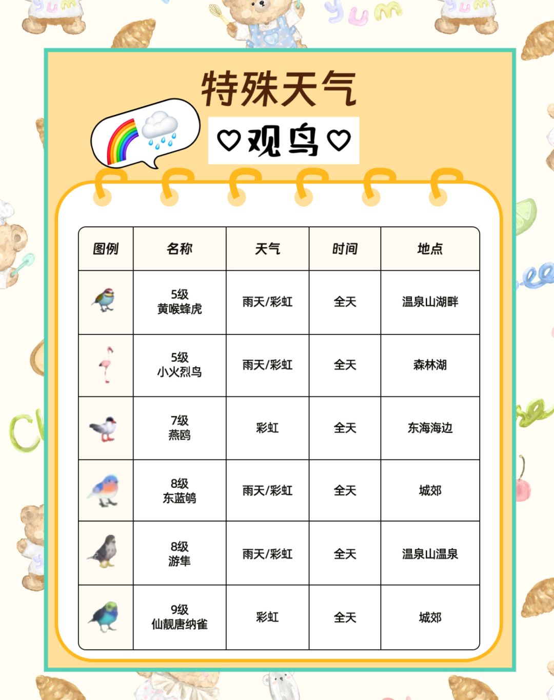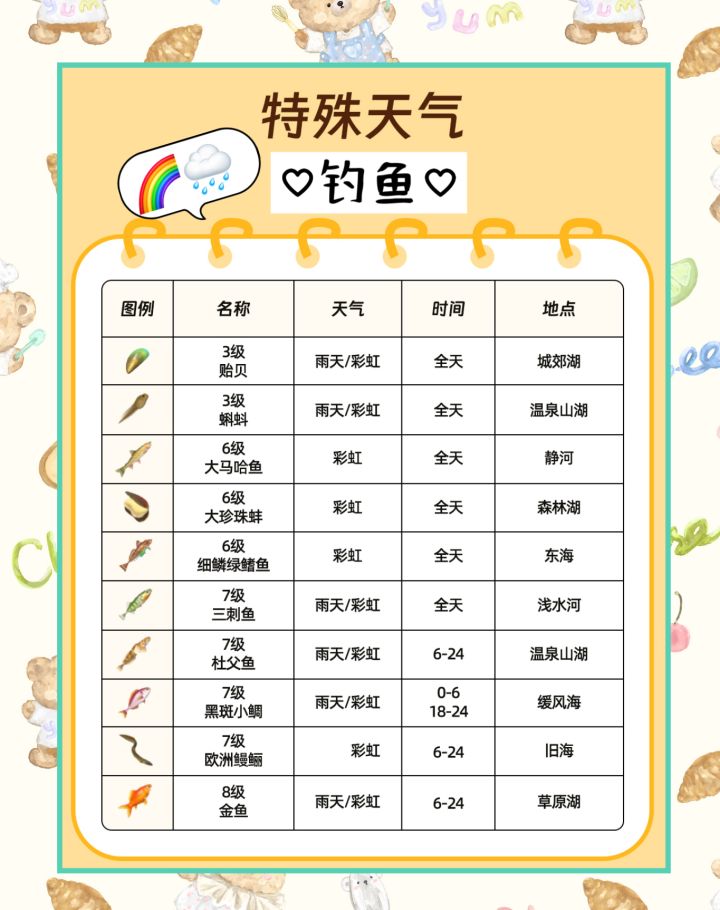 里面包括了特殊天气会出现的常规钓鱼,观鸟,捕虫