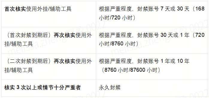 1.使用第三方外挂/辅助软件(如修改功能或数据、脚本自动挂机等),封禁规则如下:
