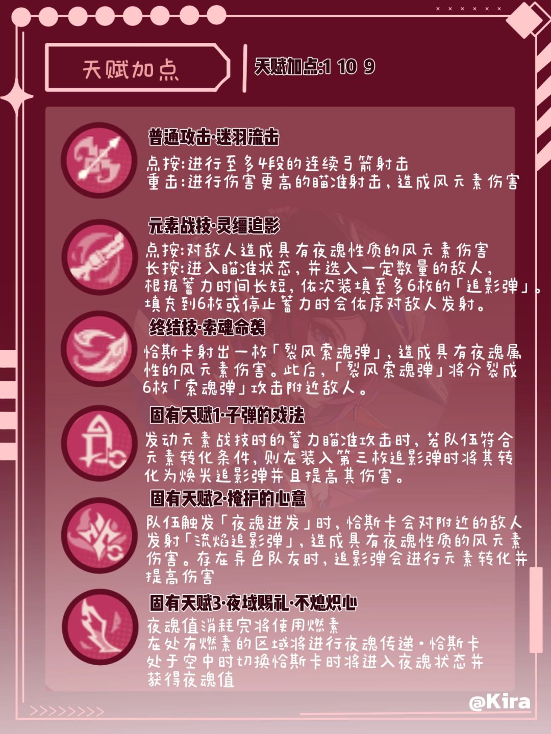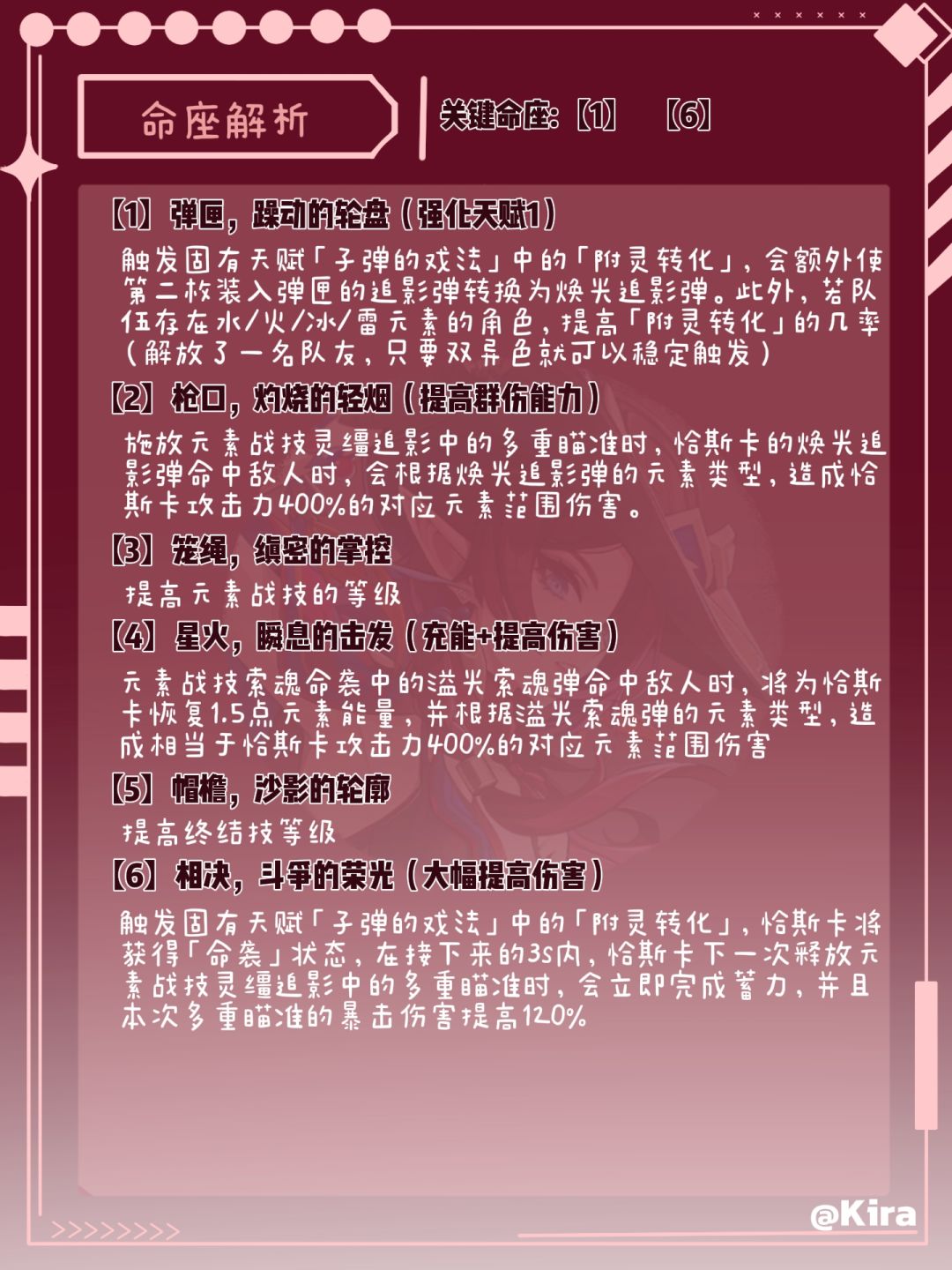 触发固有天赋「子弹的戏法」中的「附灵转化」,恰斯卡将获得「命袭」状态,在接下来的3s内,恰斯卡下一次释放元素战技灵缰追影中的多重瞄准时,会立即完成蓄力,并且本次多重瞄准的暴击伤害提高120%