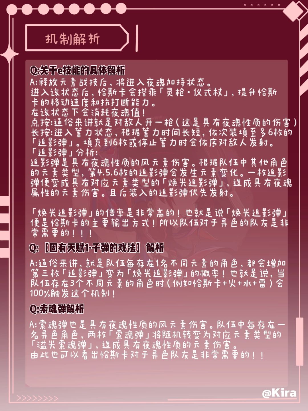 触发固有天赋「子弹的戏法」中的「附灵转化」,会额外使第二枚装入弹匣的追影弹转换为焕光追影弹。此外,若队伍存在水/火/冰/雷元素的角色,提高「附灵转化」的几率(解放了一名队友,只要双异色就可以稳定触发)