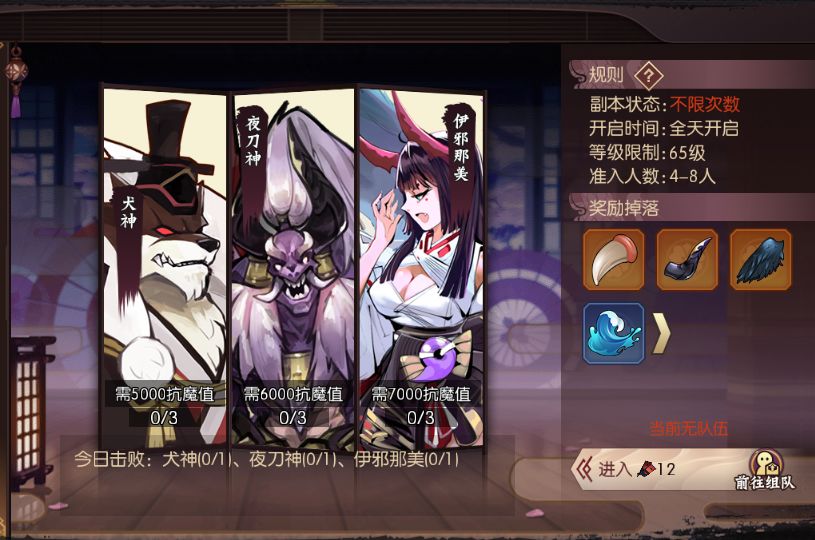 - 同时,副本对玩家的魔抗值有限定门槛,挑战犬神需要5000魔抗值,夜刀神需要6000魔抗值,伊邪那美需要7000魔抗值。
