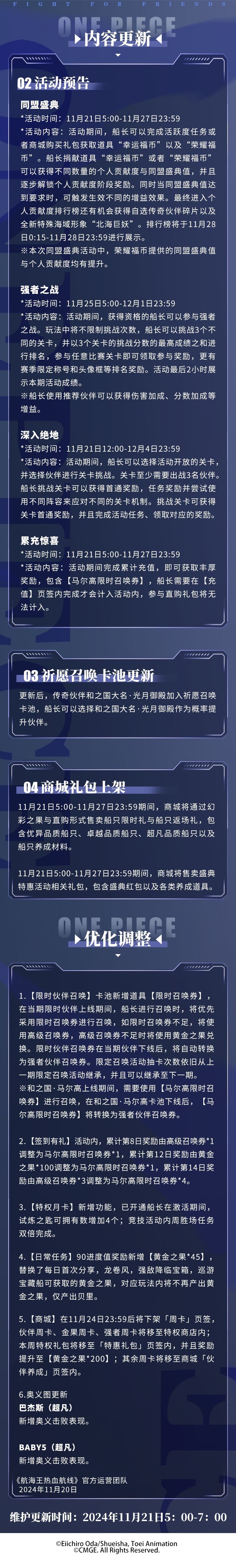 为了各位船长旅途更丰富、航行更平稳,《航海王热血航线》将于2024年11月21日5:00-7:00进行维护更新,预计停服维护2小时(可能根据实际情况提前或延后),届时将无法登录游戏,请大家互相转告并提前下线,避免不必要的损失。