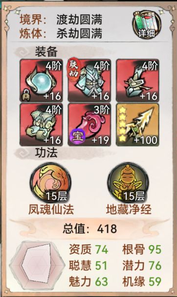 五行禅的技能如下:五行禅建议携带风魂加地藏(回合数短,更适合锁血较少的五行禅),道兵不做要求,天命最好有光华和无量。