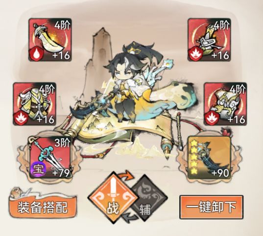 在构建阵容的弟子准备完毕后,还需要准备爬塔需要的装备:两套修罗套装、三套带速度词条的明光套装以及一套血猎套装。