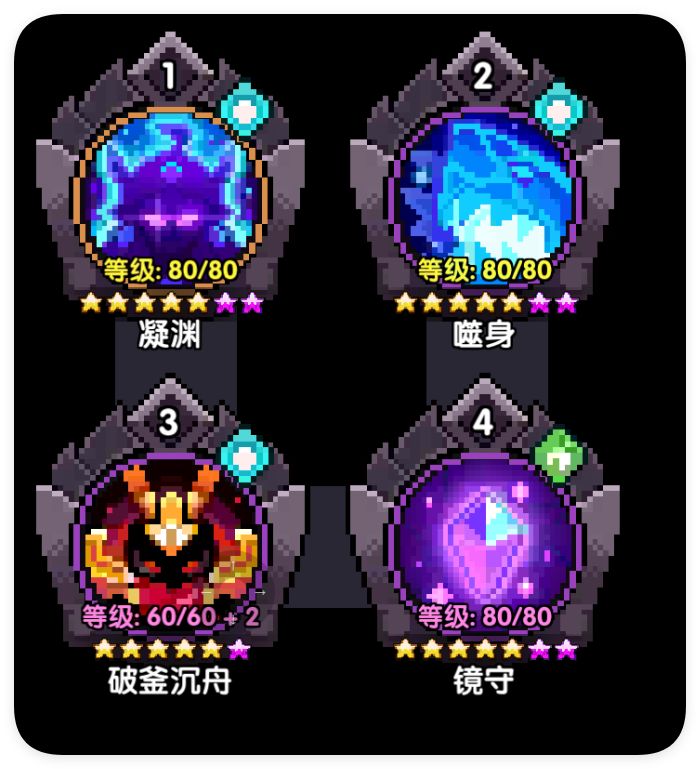 技能按顺序分别名称是:【凝渊】-【噬身】-【破釜沉舟】-【镜守】