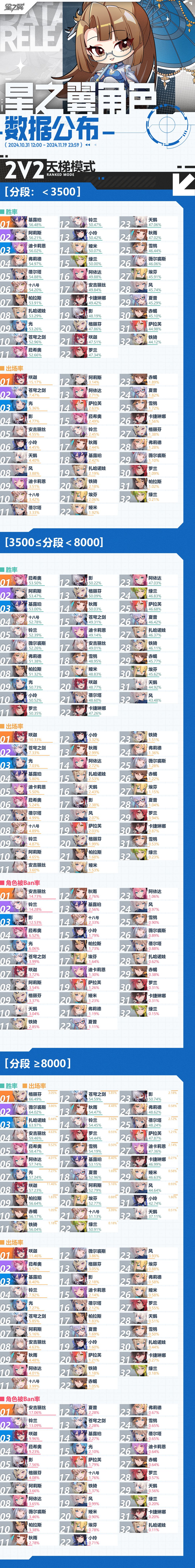 第十期各角色数据公布啦~来看看本次出场率、胜率、被Ban率榜上的都有谁呢~