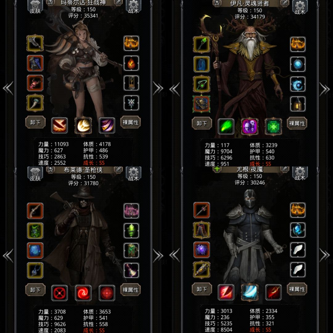 剑豪:纯力天堂刃,泰坦,战鬼,诅咒盾,火环,暴君,物伤单吸力量。加3W力速后,力速比越低越好