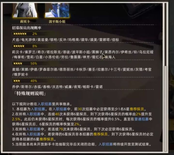 如图是三测时的池子详情,跟目前版本比较,六星角色多了信标,玛格南,反冲三名角色。
