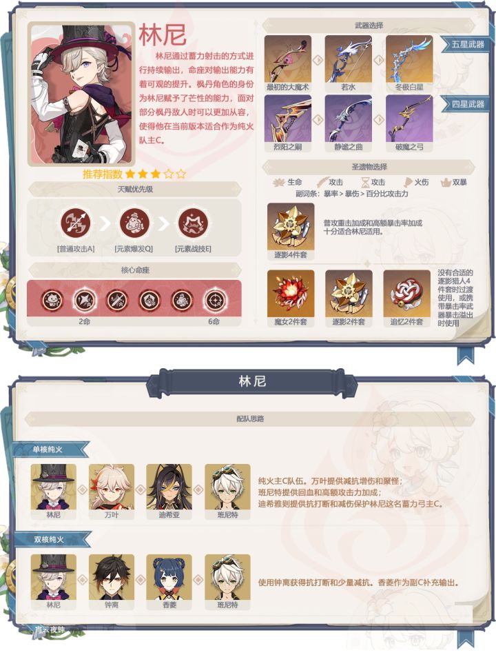 2、林尼抽取建议:林尼作为4.0的开服角色,伤害是足够的,但是蓄力弓的机制导致使用体验不太好,而且本身没有抗打断需要带盾或者像迪希雅这样能给前台带霸体的角色,如果不是非常喜欢可以不抽取,0命伤害足够,满命伤害极高,真喜欢要抽的就是0命或者满命。。