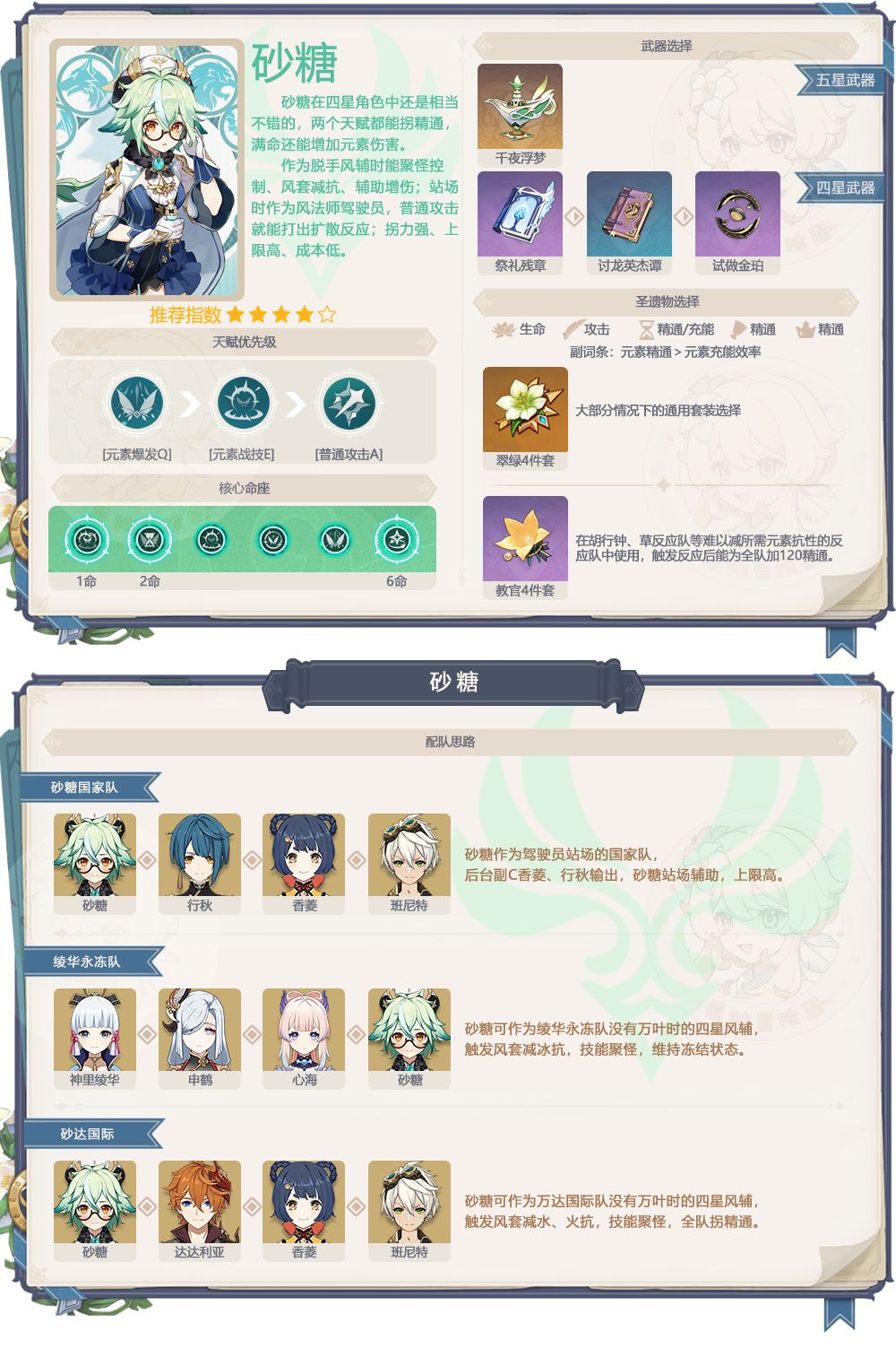 4、砂糖抽取建议:万叶的下位替代,没有风系角色萌新倒是可以捞一个使用,0命就是完整的角色,命座有不错的增伤,但不是刚需,不需要特意去捞命座