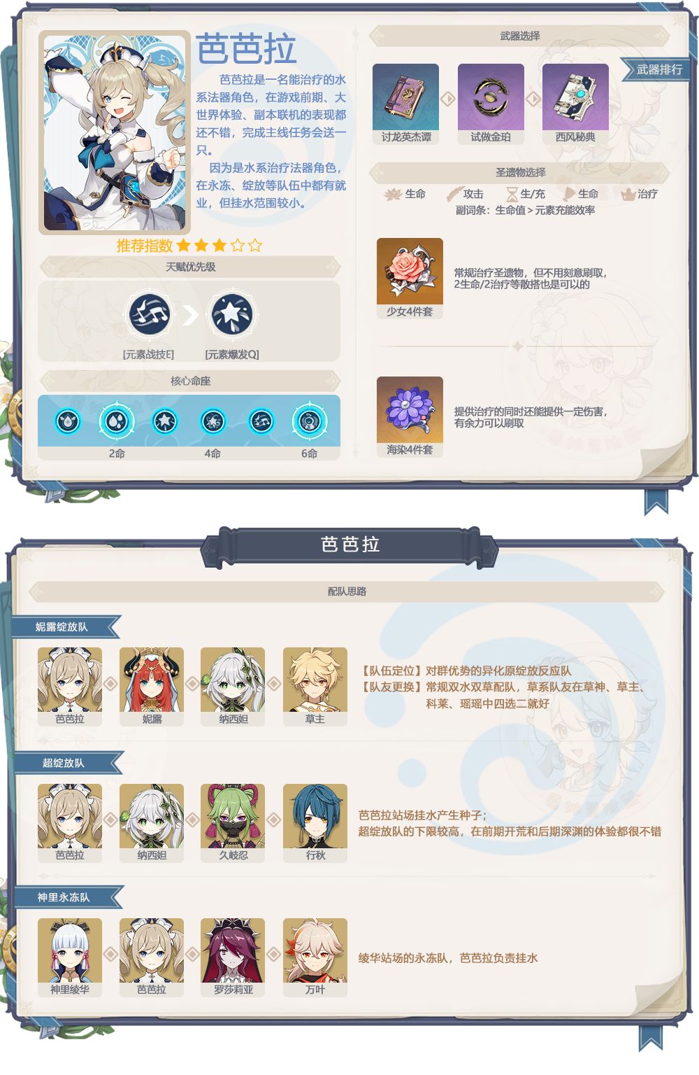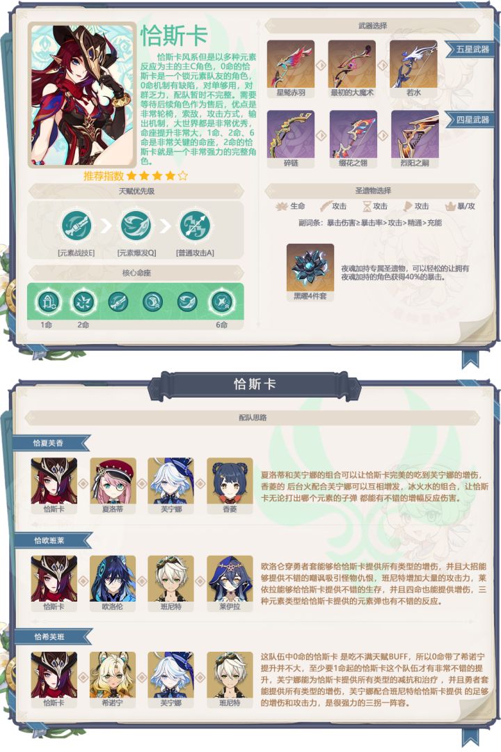 5、芭芭拉抽取建议:白送的角色,好用,不需要特意去抽命座,后期泛用性一般,特定的队伍中能作为下位替代使用上半的卡池,恰斯卡和欧洛仑是非常不错的角色,在纳塔非常的好用,欧洛伦有解密的作用,恰斯卡能飞行,跑图的神。但是从强度的角度考虑,恰斯卡2命起步组队会比较自由,所以各位要考虑清楚再抽,林尼属于有强度但不好用抽了不亏的那一类,总的来说就是真爱党不亏强度党慎重的卡池。