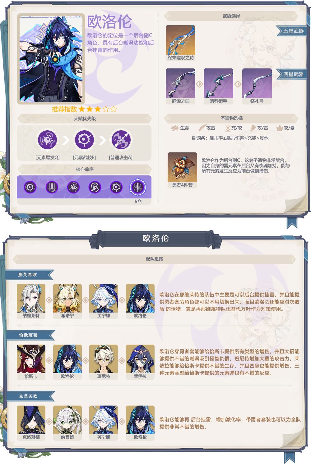 3、欧洛伦抽取建议:0命的欧洛仑就是一个完整的角色,满命欧洛仑会拥有额外的给前台提供30%攻击的辅助功能,但是不需要特意为了6命去捞命座。欧洛仑可以在后台进入夜魂迸发,进而触发勇者4件套的效果,算是非常不错的圣遗物效果触发器,在部分队伍中会很有用。