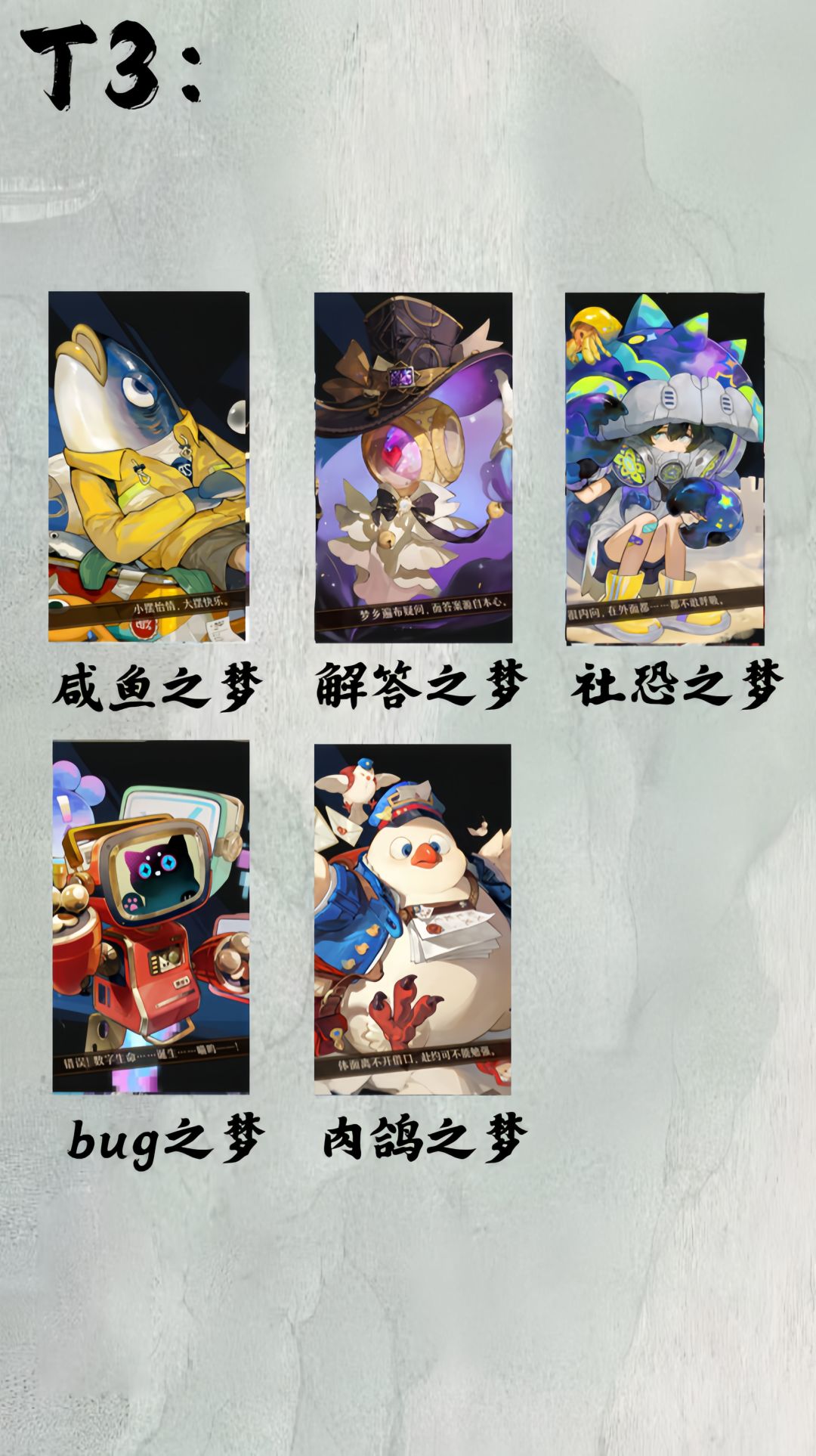 T3:咸鱼之梦、解答之梦、社恐之梦、bug之梦、肉鸽之梦