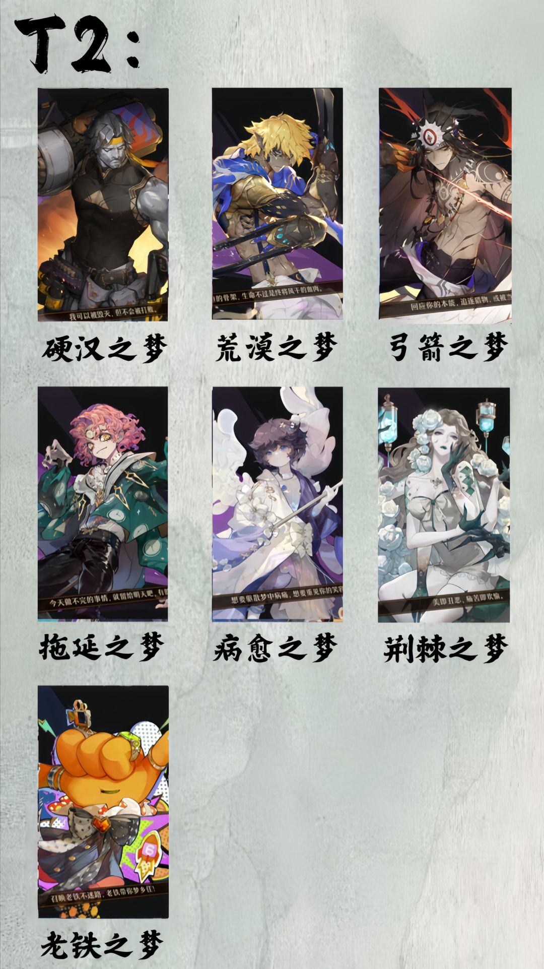 T2:硬汉之梦、荒漠之梦、弓箭之梦、拖延之梦、病愈之梦、荆棘之梦、老铁之梦