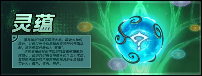 这些灵蕴通过树干和树冠散布到周围的环境中,根据它们自身所蕴含的生命力不同,其呈现出来的颜色也大不相同,蓝色是最常见的灵蕴形态,他们通常活跃在古树的根部与腰部。