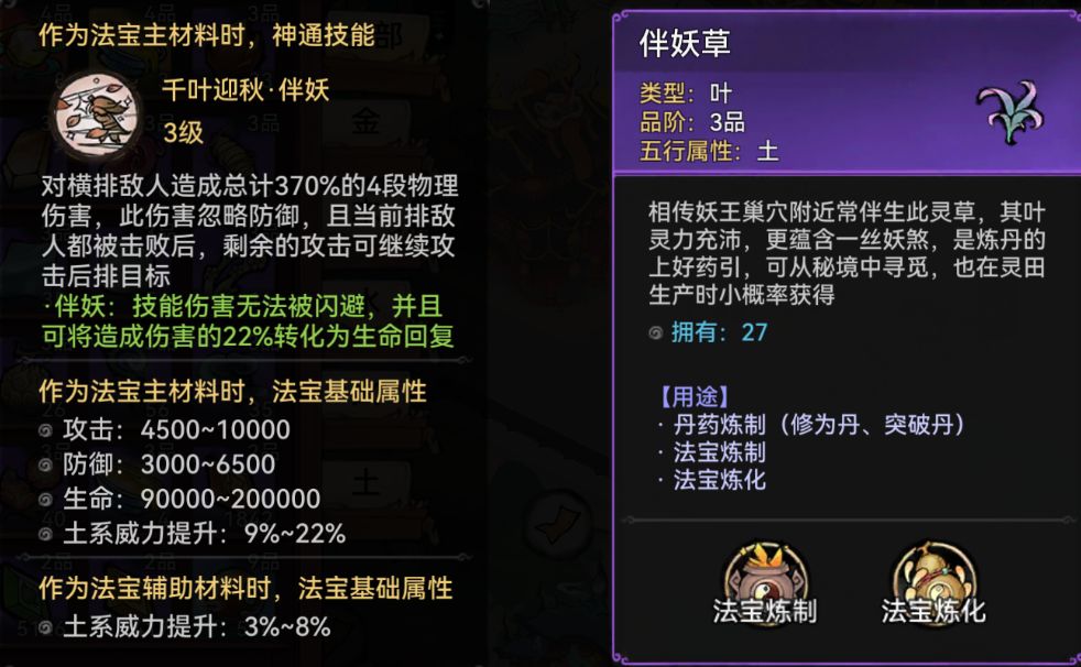 总结:推荐方案为:主材料选取土系主材料,最好选取土鳞片和砂子(8个),辅材料4个伴妖草或者4个鳞片,不建议选取防御力挡位较低的伴妖草。