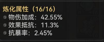 在法宝炼制的时候我们就已经知道,石头人可以通过受到暴击伤害加速进入【山岳】或者施展【碾压】,石僧进入【山岳】状态之后,普攻和施展【碾压】都可以对敌人造成眩晕,且主要输出手段【碾压】是物理伤害,因此主要炼化方向有三个:效果命中,物理伤害加成,暴击伤害减免。