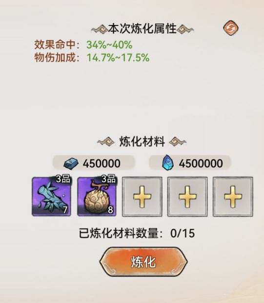 作者是选择了炼化物伤加成,即主材料用砂子,副材料用半妖草的方案,大家可以根据自己的需求去进行炼制哦。