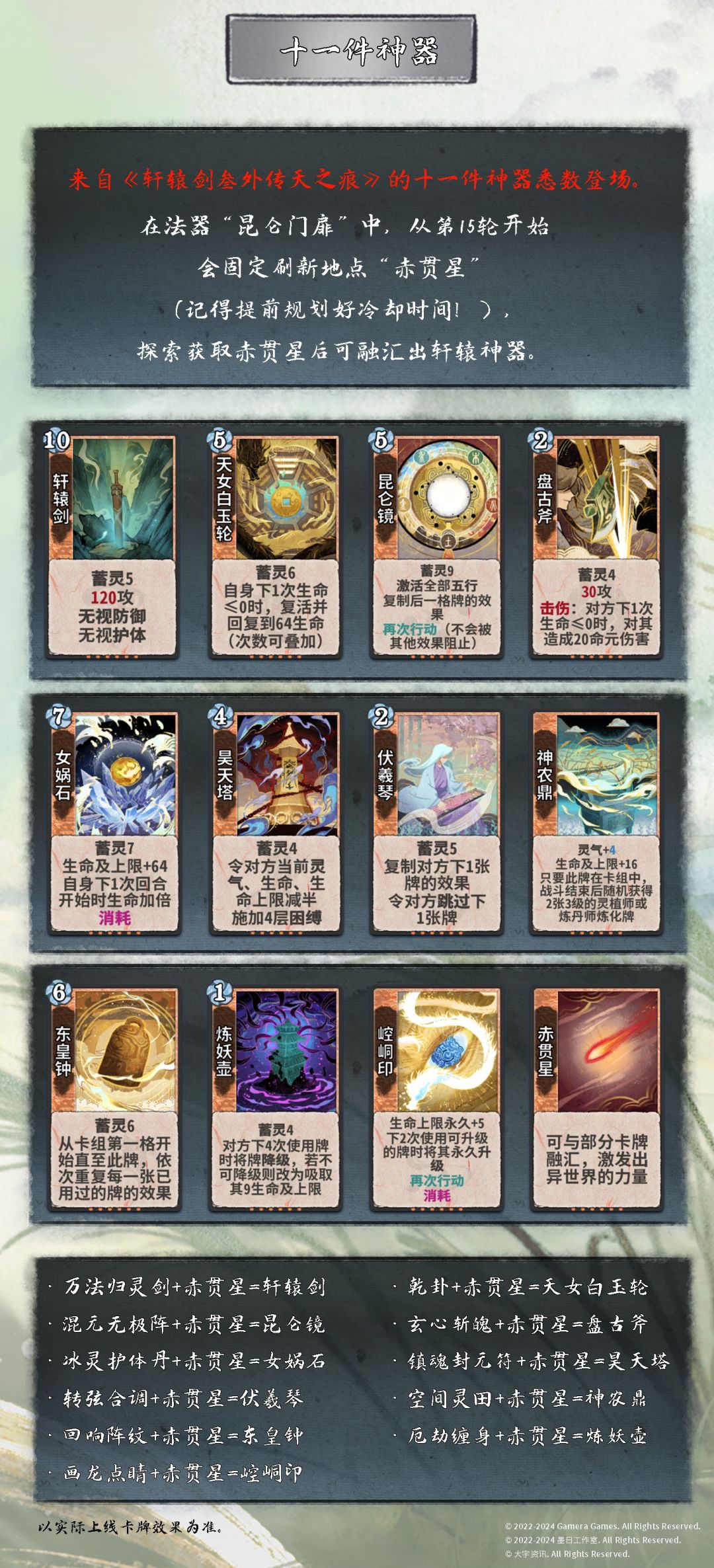 伴随着《轩辕剑叁外传天之痕》联动的上线,系列经典的十大神器也来到了“弈仙牌”的世界!