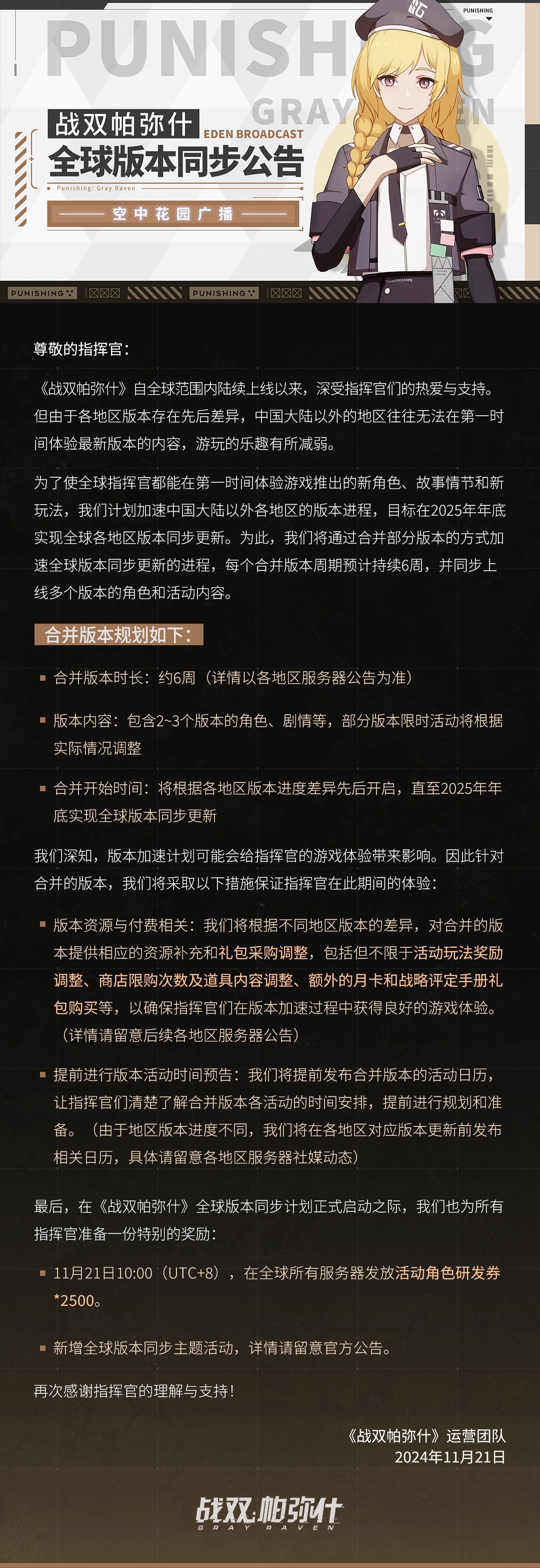 - 11月21日10:00(UTC+8),在全球所有服务器发放活动角色研发券*2500。