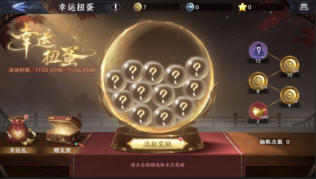 限时活动-『幸运扭蛋』将于11月22日05:00正式开启!幸运扭蛋机隆重登场。将军可以自选心仪的扭蛋奖励,抽取12次必得所选的全部奖励。扭蛋外观自选礼盒(极品光效&坐骑外观)、扭蛋头像/头像框/称号自选礼盒、金色计略碎片自选、金色万能碎片、英雄帖等好礼都在扭蛋机中等待将军抽取!