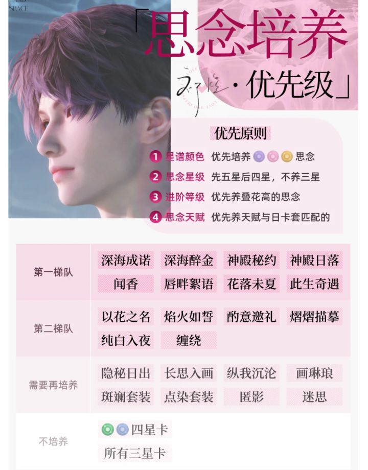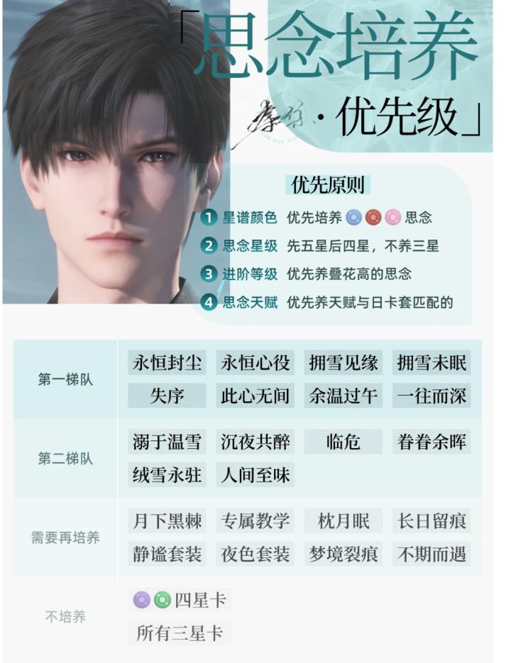 食用方式限定卡和常驻卡都排在了一起未拥有的卡直接往 顺延即可2(第一梯队)培养至50级觉醒或60级之后就要开始刷芯核了再往后养卡的提升效率不如刷芯核。芯核关6就开 始掉金色芯核了但6、7关掉落概率太低不要投入资源 刷刷到能用的强化+3+6之后尽量往后打 3(第一梯队)(第二梯队)是爬塔的常用卡(需要再培养) 的卡用得不多但也会用到如果资源吃紧可以先不培养 用到再拉 但一般常驻卡的进阶等级要比限定卡高属性大概率优于限定卡这时应该先比较两者的属性值选择高的培养