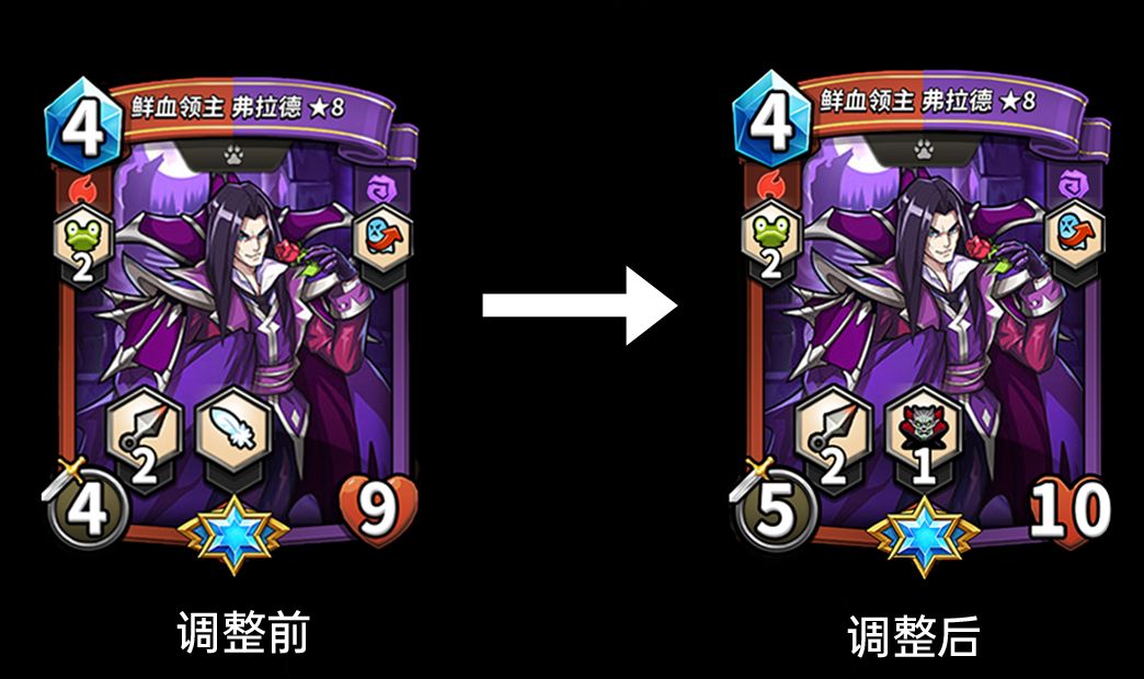 调整后:「鲜血领主 弗拉德」的生命值由9点提升至10点,攻击力增加1,新增<血亲王技能>。