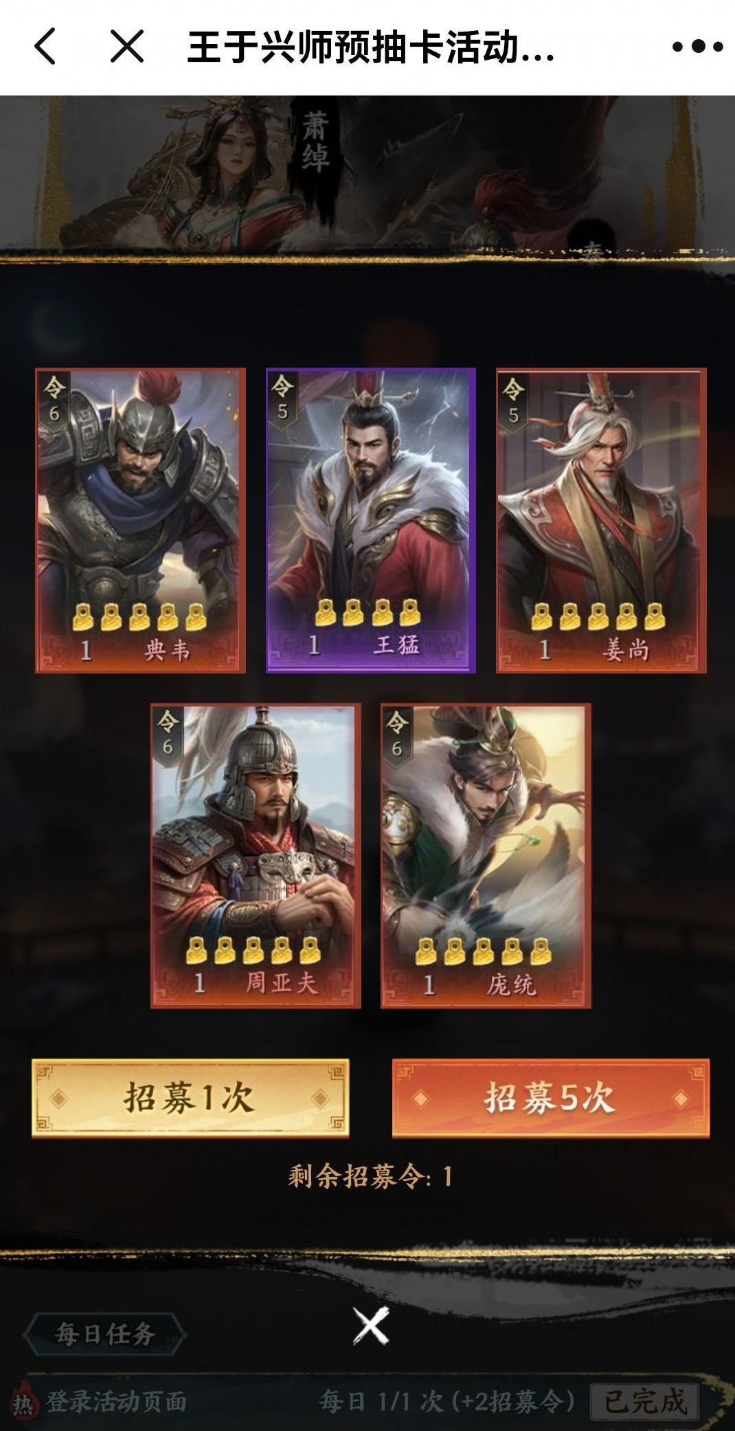 这款游戏在Tap上没有开放预约,但还是被敏锐的小编发现了,王于兴师是一个即时沙盘战略手游,我看了一下,好像该游戏有挺多卖点的,各位热爱SLG类型游戏的看官可自行搜索了解。对于预抽卡方面,该游戏也是相当相当相当的良心了,上线14抽虽然少,但是爆率真的非常高啊,小编一改往日非洲体质,变欧皇了,谁懂啊,一个五连一个单抽,出了5红,墙裂推荐各位大大们试试水!!