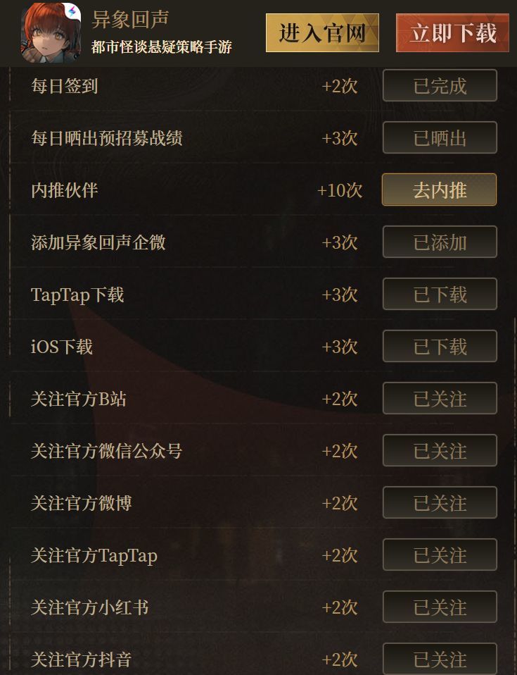 异象回声是一款都市怪谈悬疑策略手游,也是在预抽卡方面呼声最高的一款游戏,小编也是迫不及待的开启了抽卡,真别说,活动真的挺良心的,做完一小堆非常容易的任务(活动如下,分享和关注只需一键,后同)便可得到26抽,爆率我也进行测评,26抽出了两五星,可惜重复了,总的来说爆率不错,真的值得去试试水!!