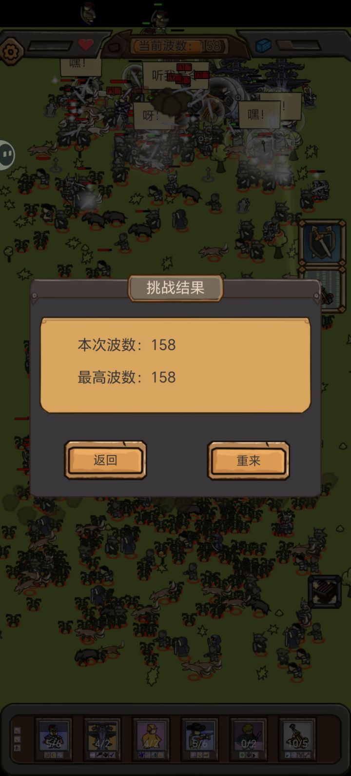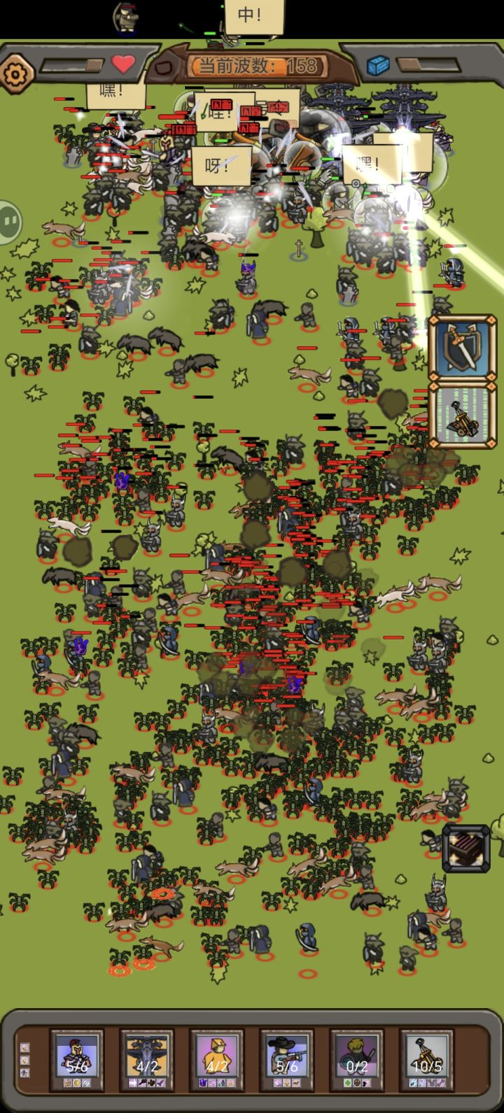 开局前压,投石车最后一个出然后文库锁定投石车,5人口以后取消前压开始让勇者送死,用勇者的限定技能刷出4战舰10投石车12锯片。大概80波之前都能搞定,然后继续前压一直到150+,压不住就回撤。(我开小差回撤晚了,死了很多锯片,不然大概能160+)