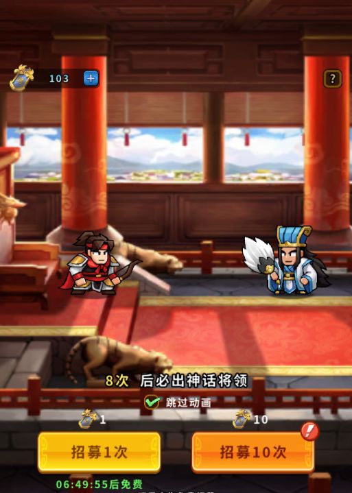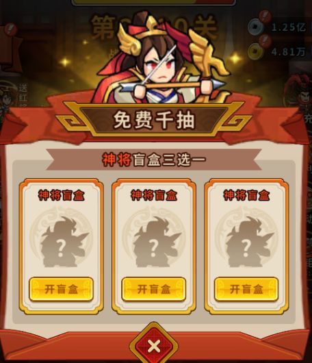 每当主线推进50关时,便可从“免费千抽”活动界面三个神将盲盒(等于10抽招募令的结果),三选一领取