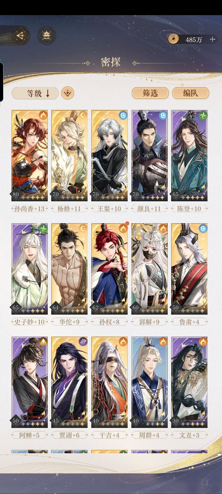 师尊的留音也拿完啦(后面还多了一个,附上练度。8-24配队:狮子喵,颜良,香香,王璨,陈登,单输出得赌香香全暴击,两遍才过去