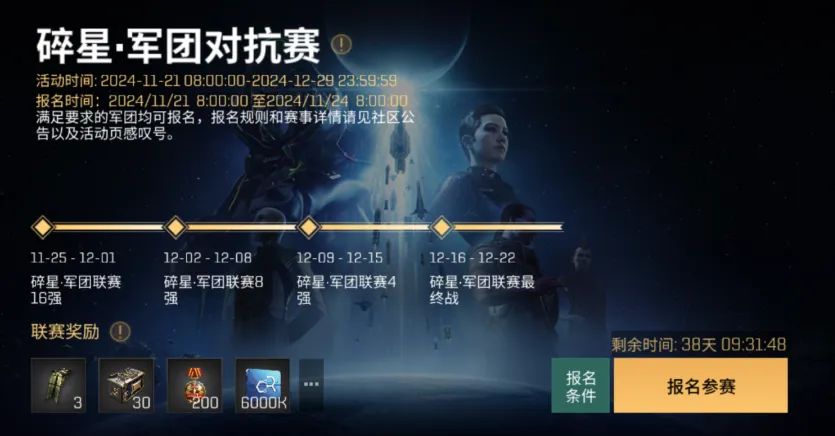 1.比赛前,每支军团需要提前报名,报名截止时间为2024年11月24日08:00:00。