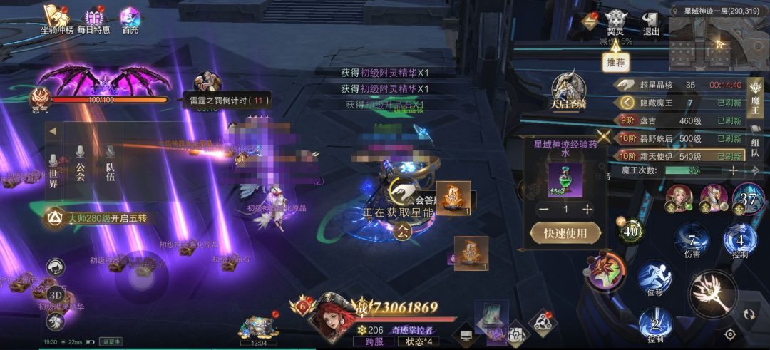 这样打死Boss后不会浪费时间跑路捡物品,满怒气会存在一定的逗留时间,在Boss死的时候采集旁边的超星晶核,掉落物品小恶魔负责拾取,这样利益会最大化。