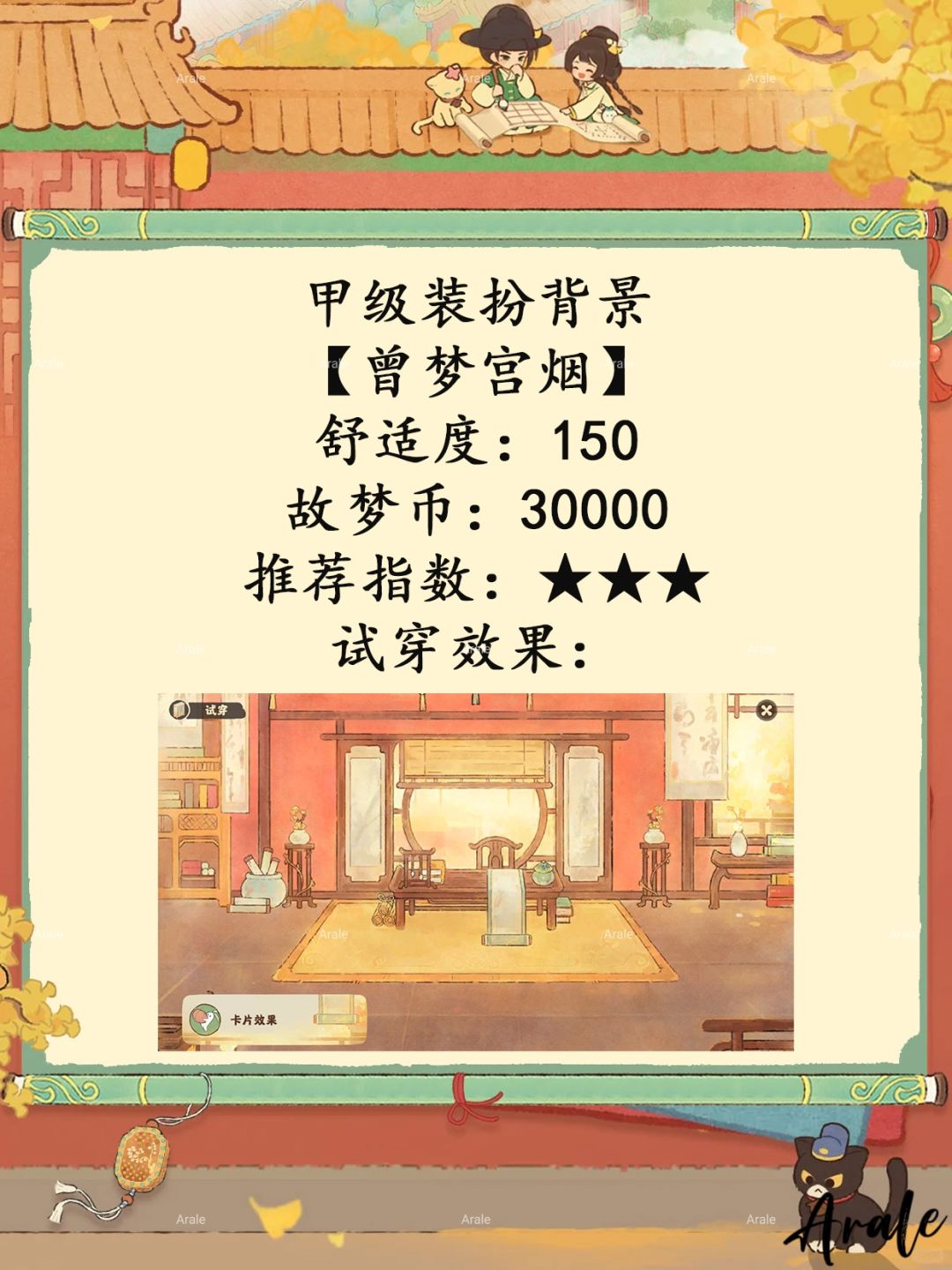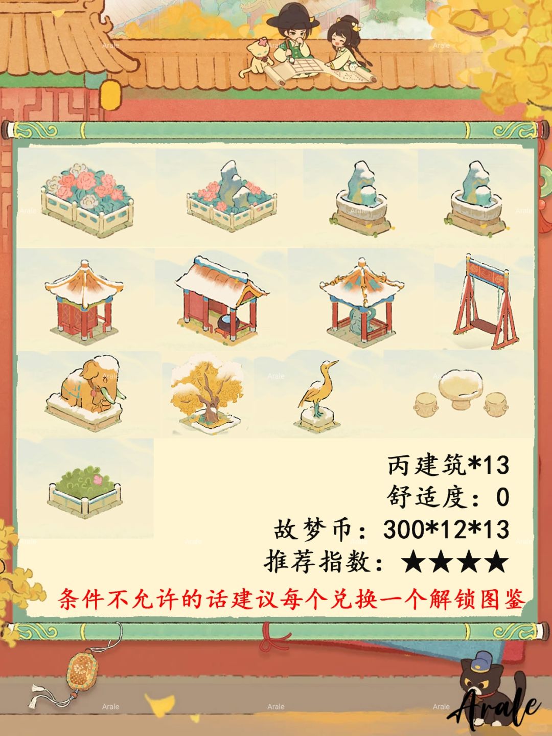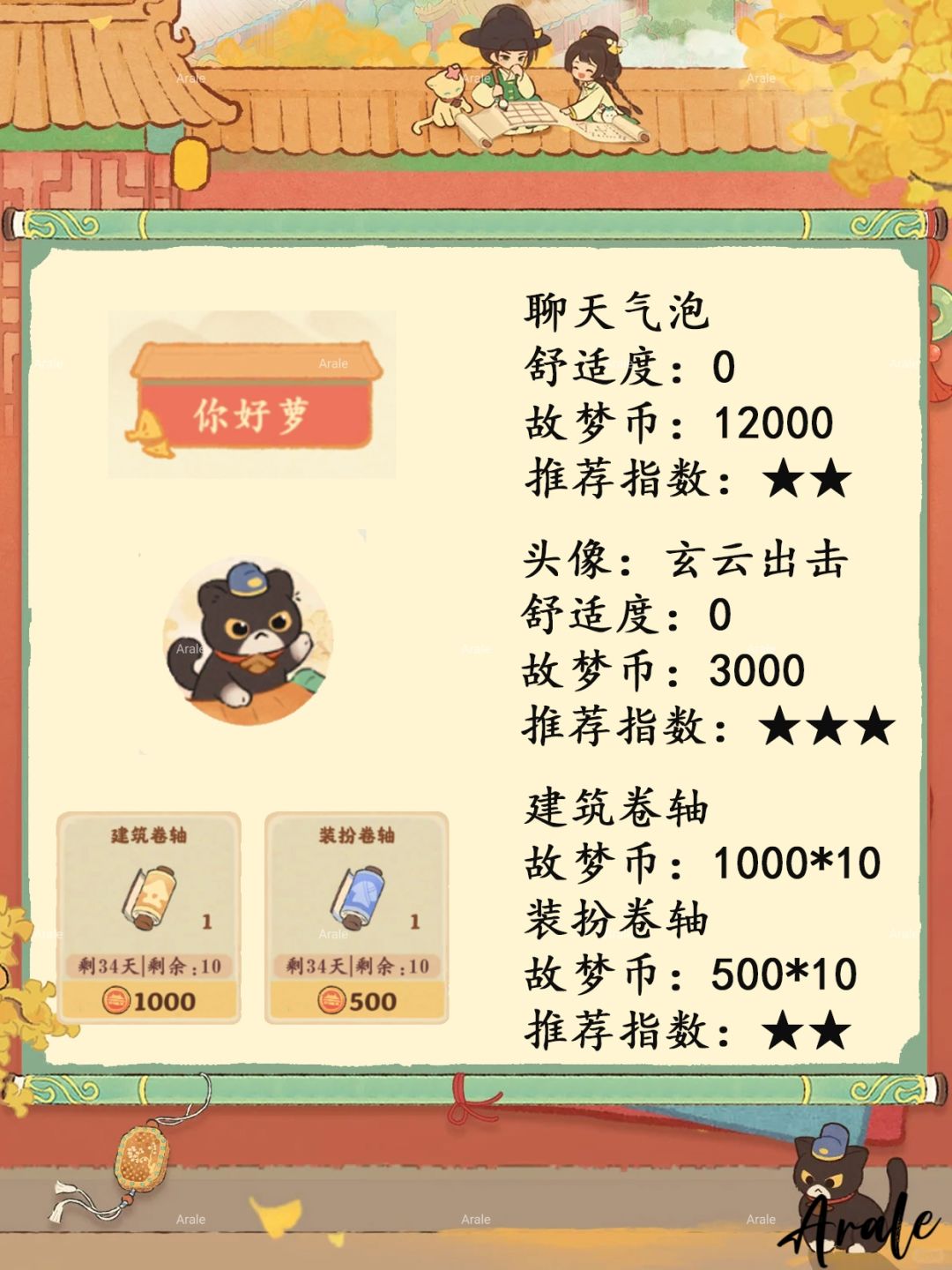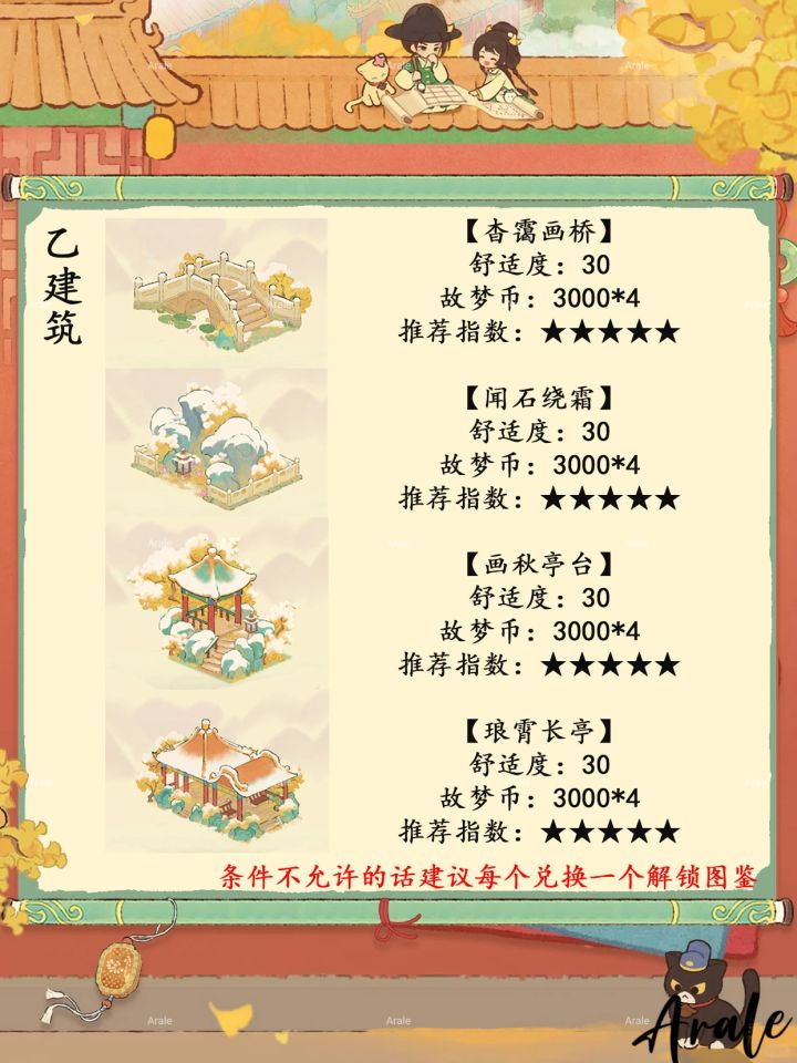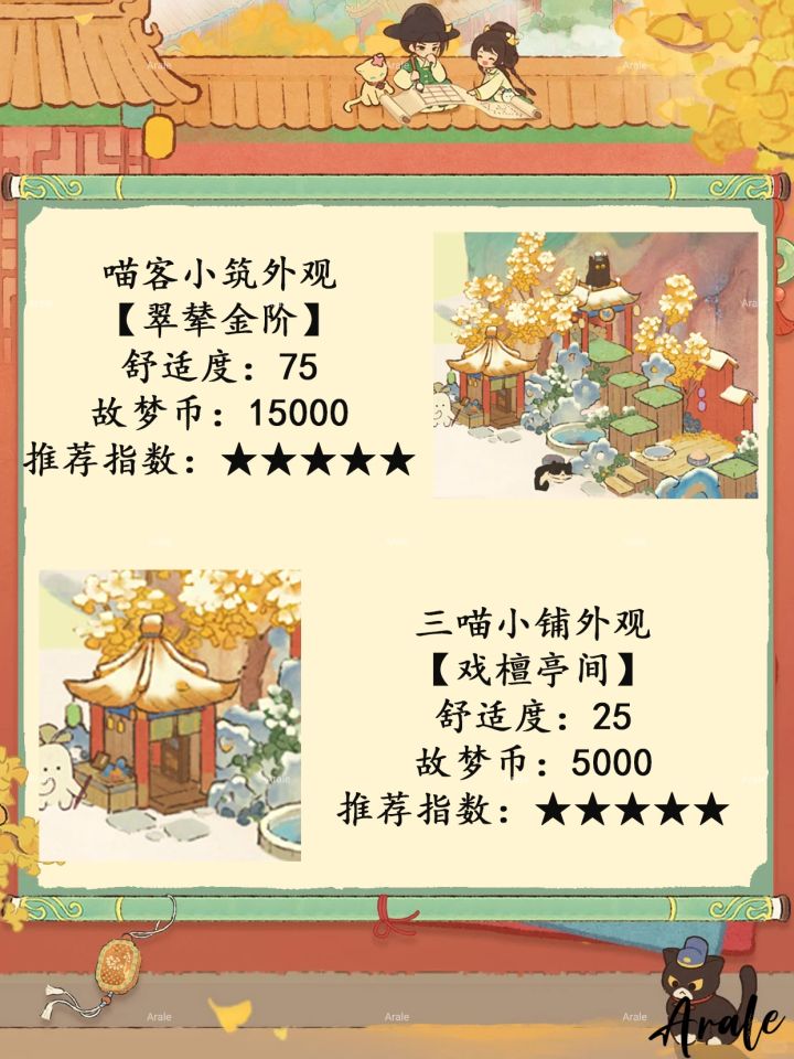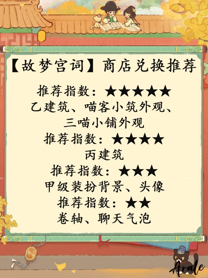 【故梦宫词】商店兑换推荐,推荐指数:★★★★★:乙建筑、喵客小筑外观、三喵小铺外观。推荐指数:★★★★:丙建筑。推荐指数:★★★:甲级装扮背景、头像。推荐指数:★★:卷轴、聊天气泡。