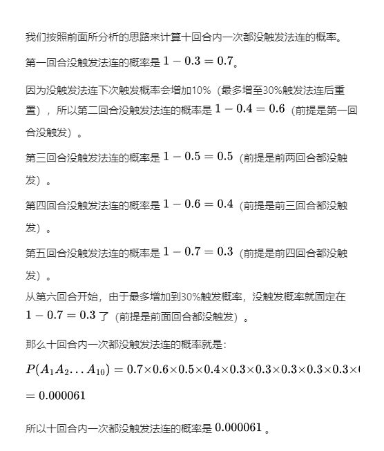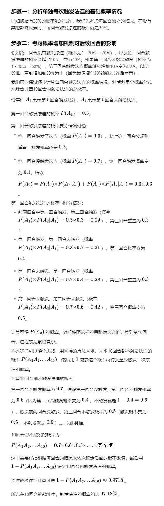 还在说自己的召唤兽打了法连,不经常连吗?#关于召唤兽灵饰的选择,最没用的就是烽火连天这个技能。烽火连天技能设定是没有使用群体法术时,满足触发法连但未触发,下次触发概率增加10%,由此就可以得出图一的概率计算。就拿日常的凶兽跟妖王来算,一场战斗10回合,却得出不同的结论。
