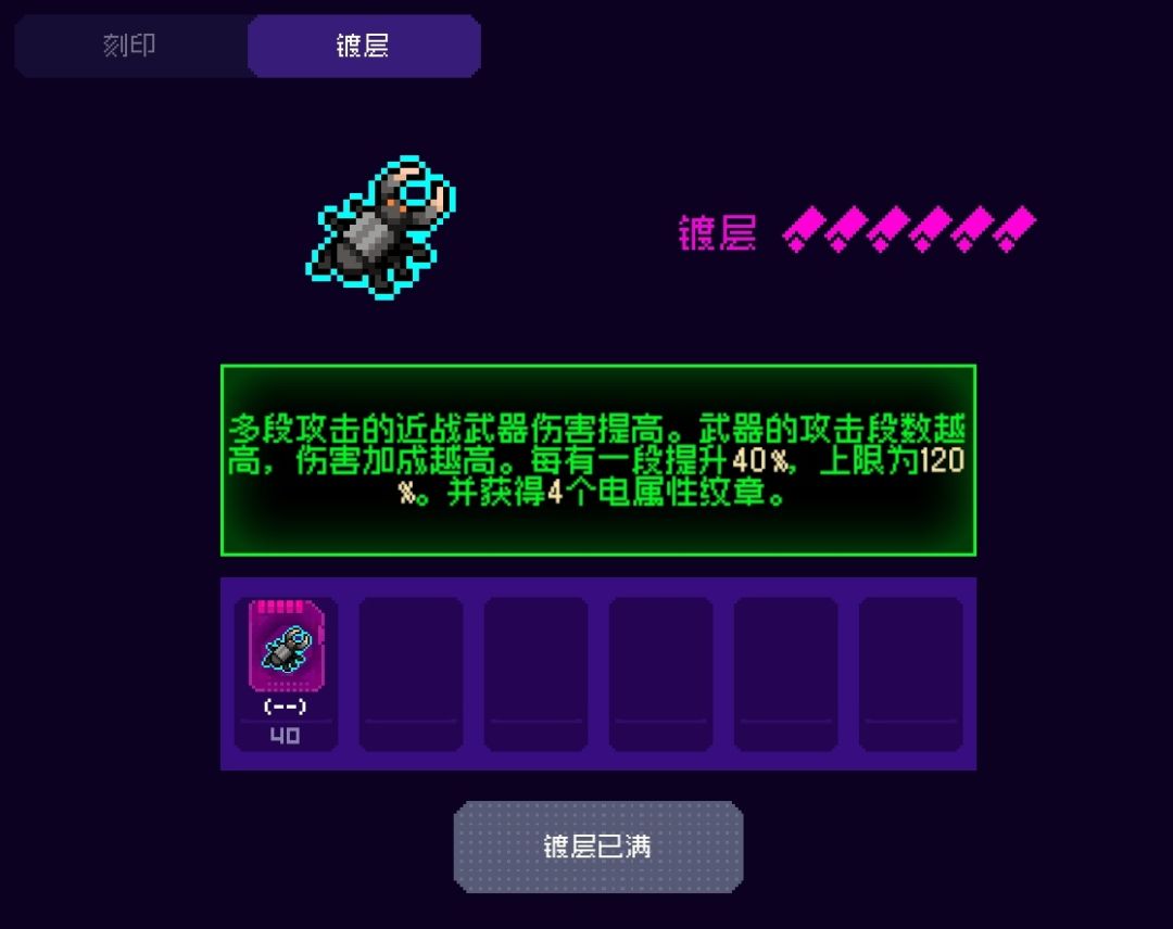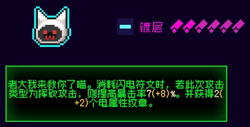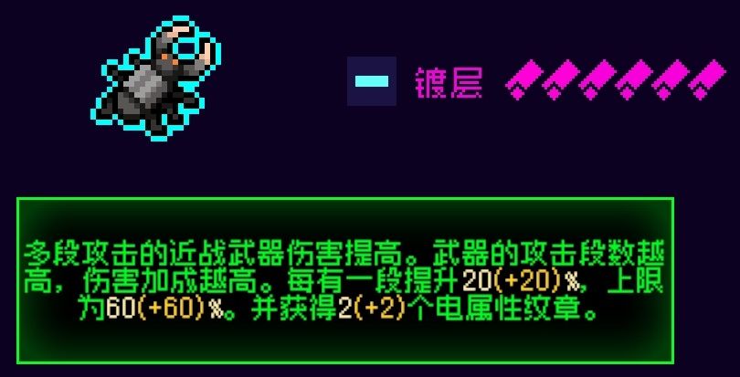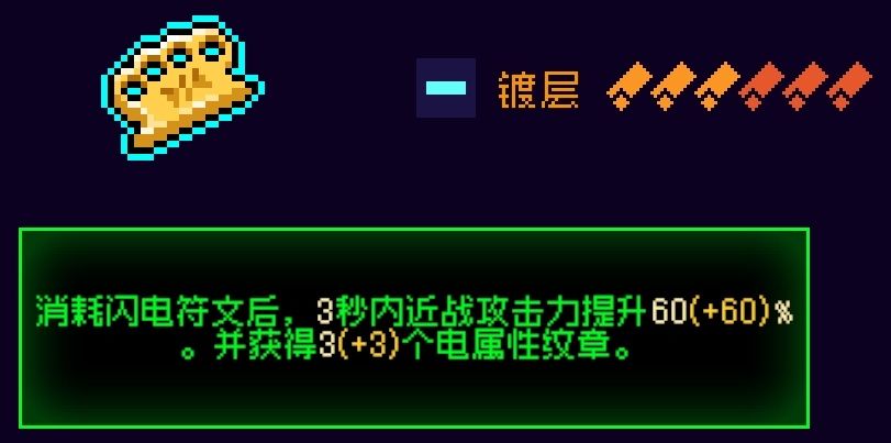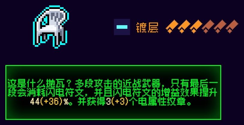 看完了前两个优点,相信各位已经摩拳擦掌了,但这里我要先说一个缺点,那就是电刀套必须要求有多段类型的纯近战攻击才可以玩,否则攻击甚至都消耗不了闪电符文,更别说触发那些效果了。