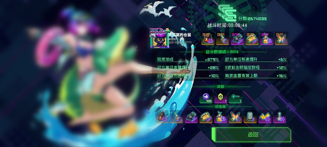 注意事项:角色推荐使用纱夜模组#2,局内必须拿到拳套、莲花、磨刀石以及正常业火套的必备道具,第一波推荐先拿业火,否则都不方便清怪,下面是参考成绩。