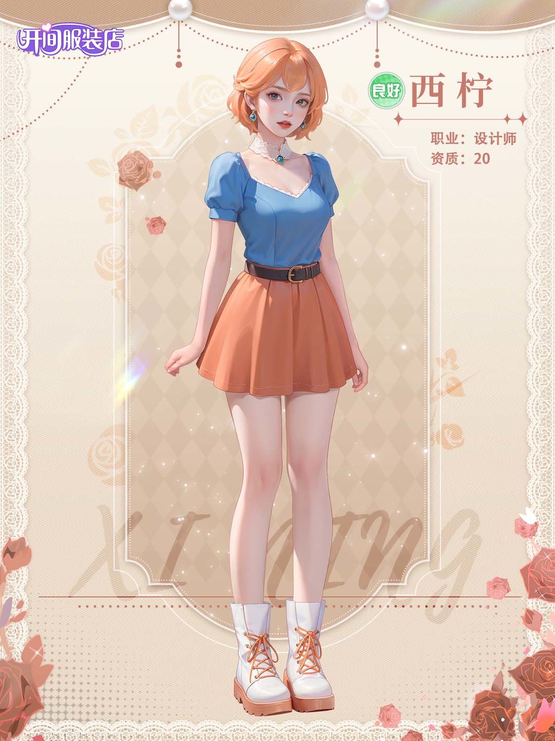 西柠,这位甜美可人的女孩,拥有着一头亮丽的橙色短发,仿佛夏日里的一抹灿烂阳光,既活泼又不失时尚感。她的眼睛犹如两颗晶莹剔透的红宝石,闪烁着聪颖与灵动的光芒,仿佛能够洞察时尚的每一个细微变化。她的穿着搭配更是彰显了她对服装的独特品味。一件蓝色的上衣紧紧贴合着她曼妙的身姿,既展现了她的优雅气质,又不失青春的活力。而下身的棕色短裙,搭配着黑色皮带,更是将她纤细的腰身完美地勾勒出来,给人一种俏皮又不失性感的感觉。脚下的白色运动鞋与棕色的袜子相得益彰,既符合了她作为设计师的时尚敏锐度,又透露出她休闲随性的生活态度。