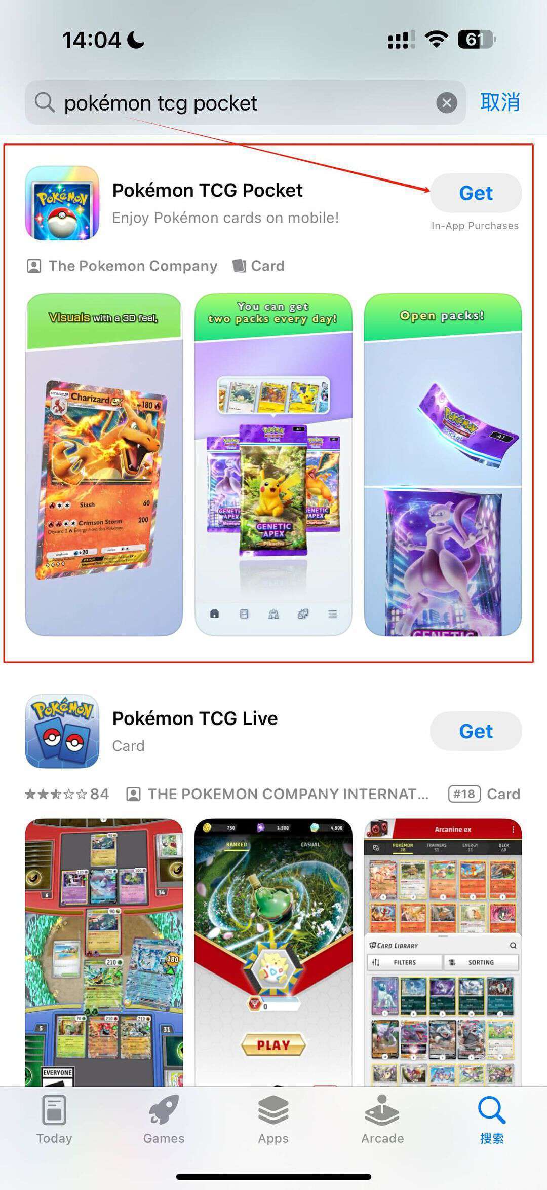 第一步:AppStore登录外区商店,搜索【pokémon tcg pocket】即可下载游戏