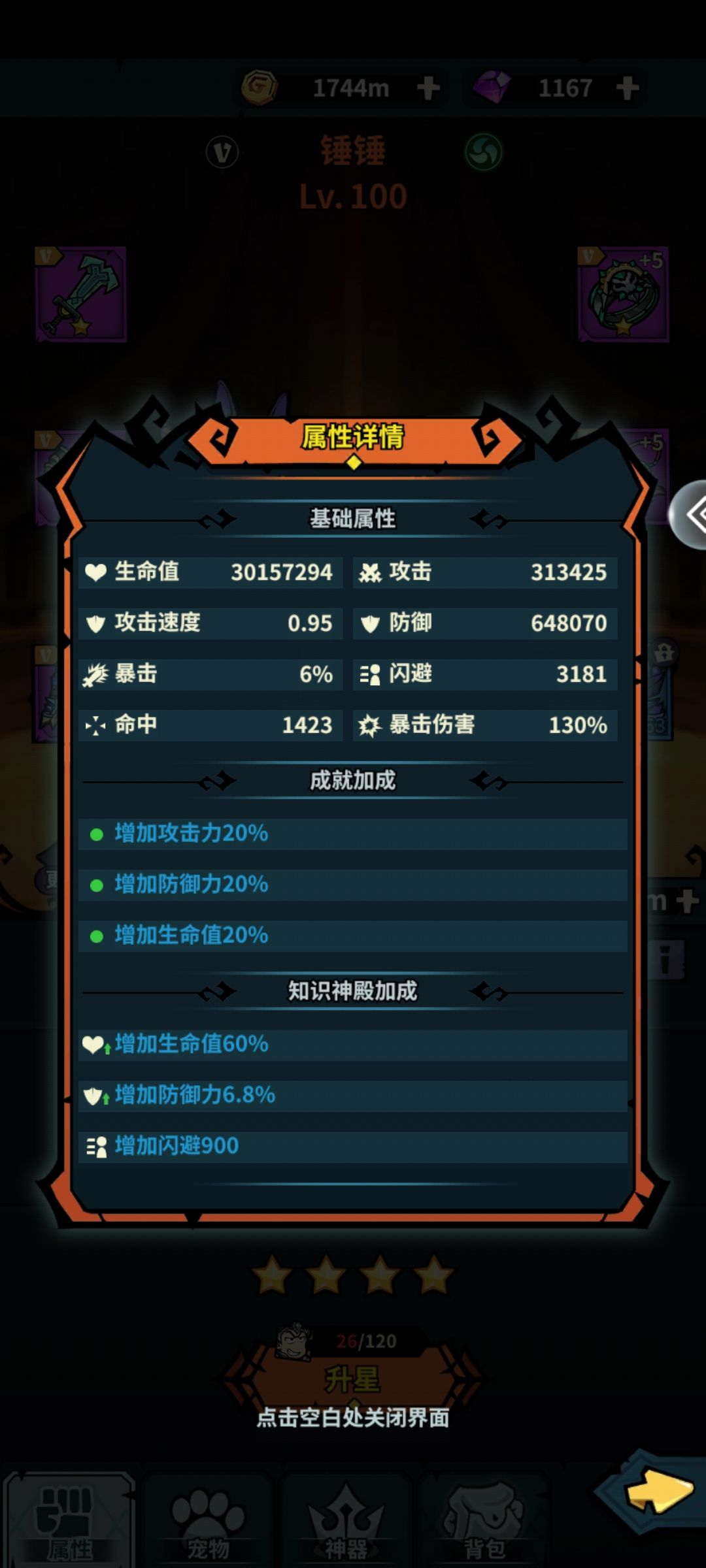 至于攻速为什么排暴击前面,我是这么考虑的,攻速快就可以打出更多的攻击次数,触发更多的暴击。而且神器中有概率3倍伤害和20倍伤害的技能,攻速快触发几率会更高。