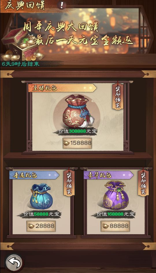 活动期间上架3个价格档次的礼包。仅可选择购买一个。