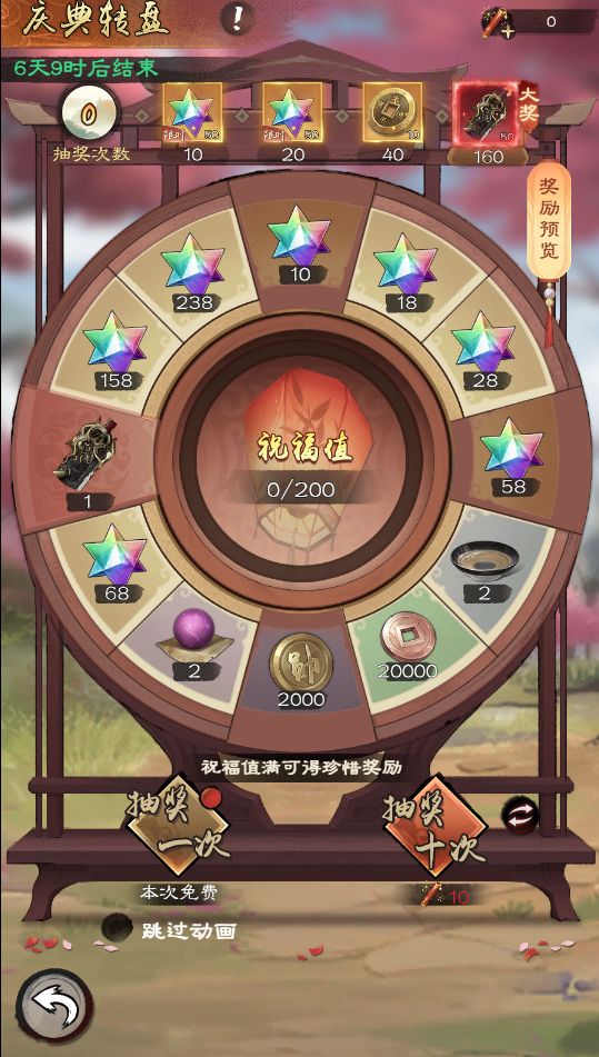 少主每日有一次免费抽奖的机会,也可以使用【爆竹】进行抽奖获得【庆典花火】、神兵利器、红品功法等奖励。少主每次抽奖增加1点祝福值,祝福值满获得珍贵奖励!