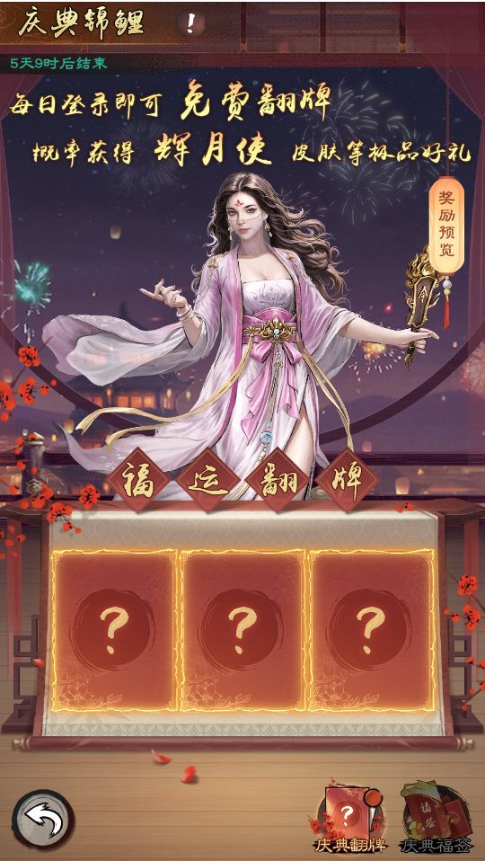 活动期间每天登录即可免费翻牌一次,概率获得辉月使皮肤等极品好礼!