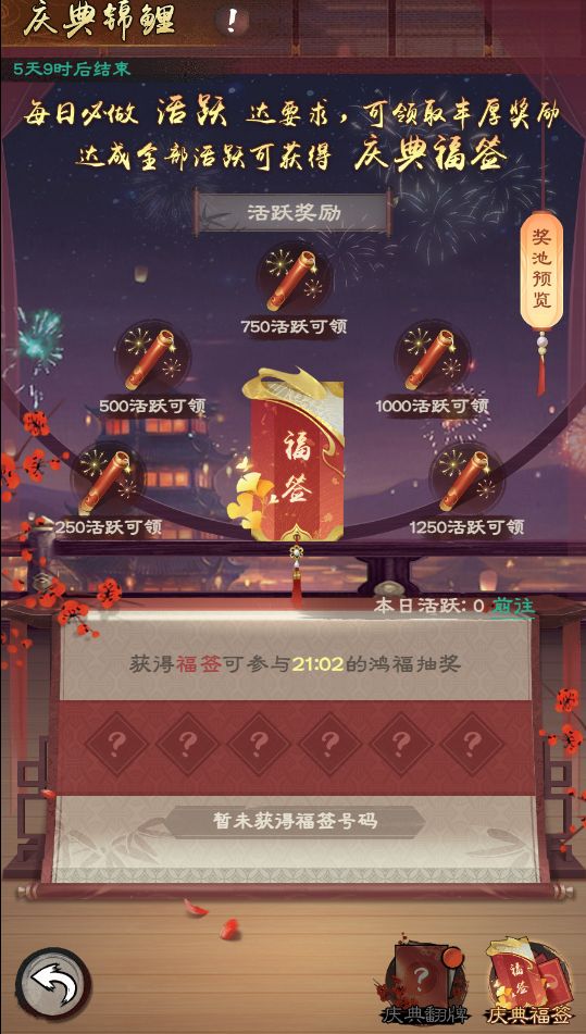 此外,活动期间每日必做活跃值满足要求可领取活跃奖励。21:00前活跃值达到1250更可获得福瑞大奖抽奖资格。