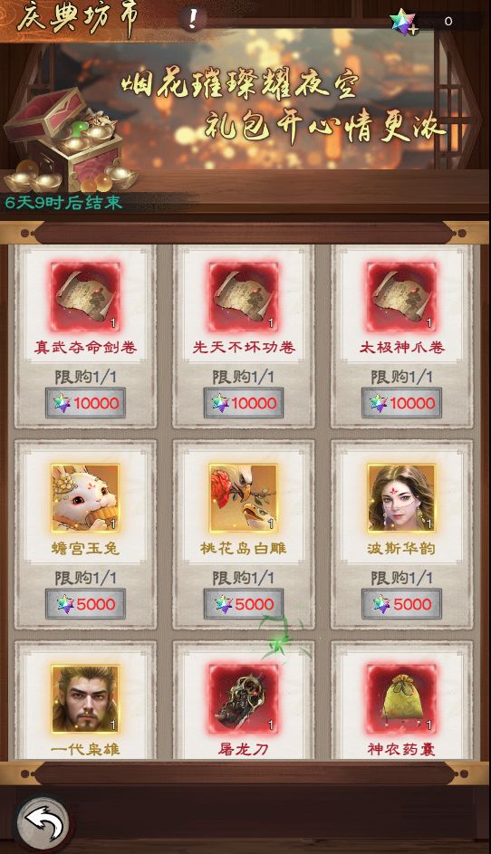 活动期间使用【庆典花火】兑换奖励,不但有【蟾宫玉兔】、【桃花岛白雕】、【一代枭雄】的限时返场,还有各融合卷轴可以兑换,更有辉月使最新皮肤【波斯华韵】,走过路过不要错过~