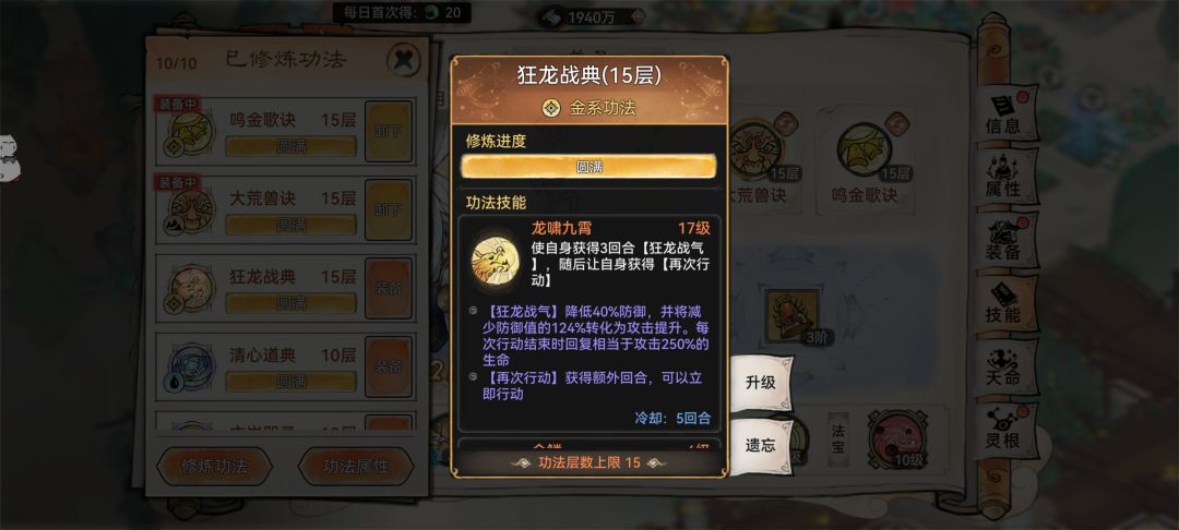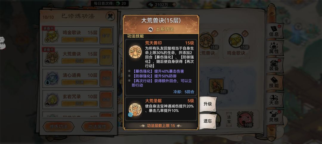 6. 功法选择:银无月的功法首选玄岩(研习+20)+鸣金(研习+20),可以开局套玄岩盾,第二回合接上土鳞片盾;